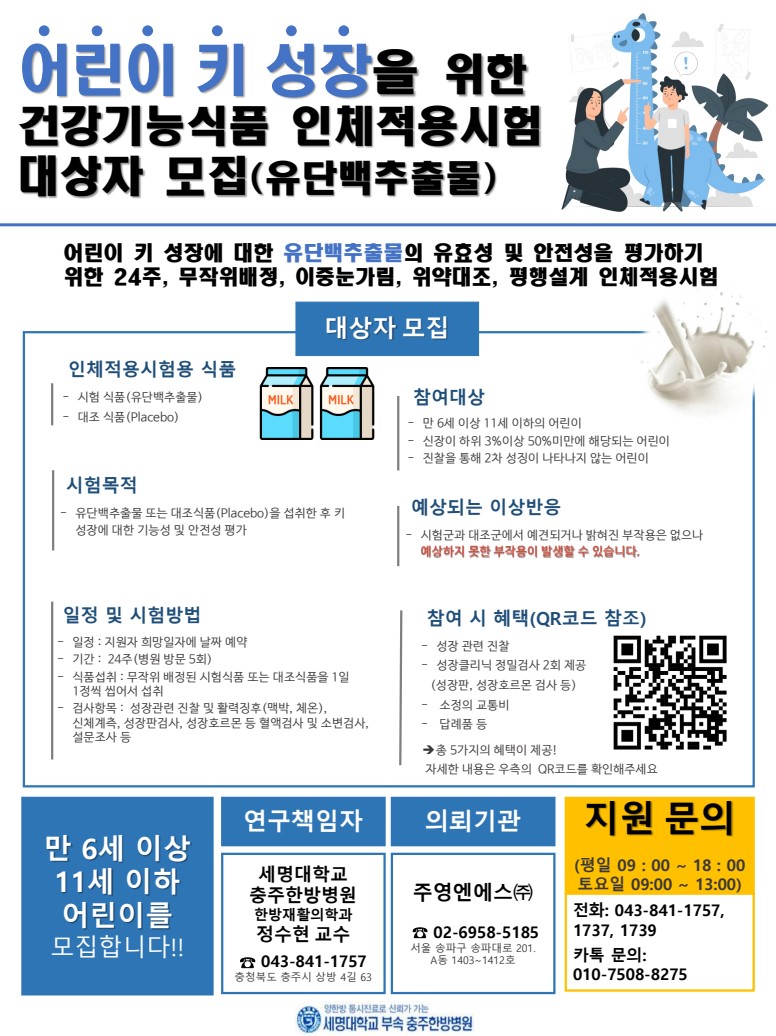 어린이 키 성장 "유단백추출물(엠비피)" 인체적용시험 안내